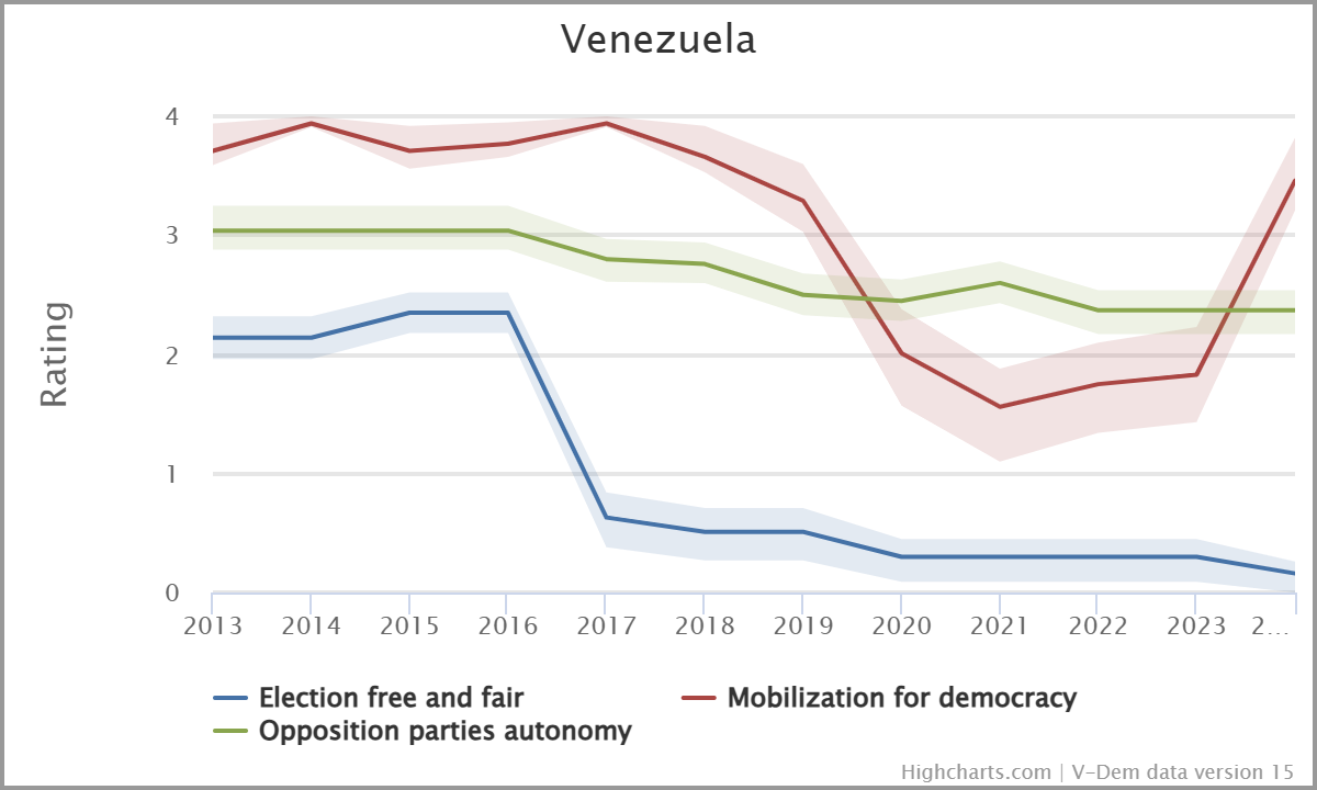 Venezuela experienced a sharp deterioration in democratic conditions between 2013 and 2024, coinciding with Nicolás Maduro’s rise to the presidency. Three key indicators—free and fair elections, mobilization for democracy, and opposition parties’ autonomy—are measured on a scale from 0 (absent or weak democratic qualities) to 4 (strong democratic qualities).