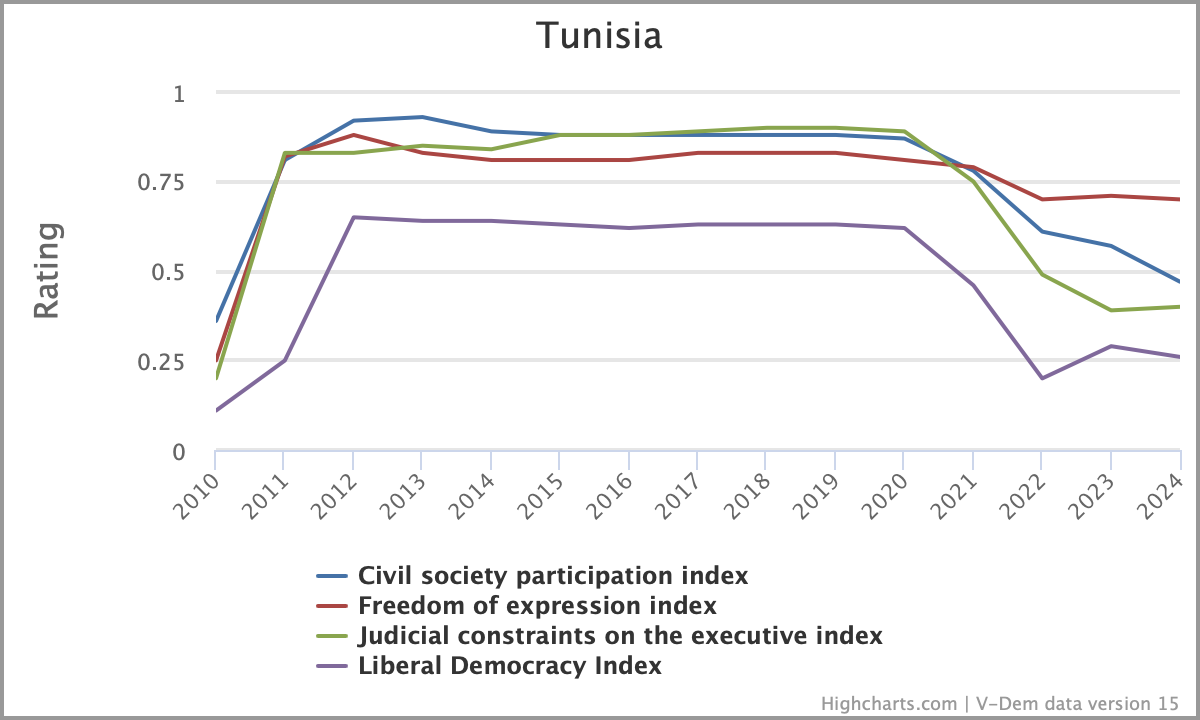 This week’s graph illustrates the democratic reversal in Tunisia from 2010 to 2024. The four indices evaluate democracy on a scale from 0 (absent or weak democratic qualities) to 1 (strong democratic qualities).