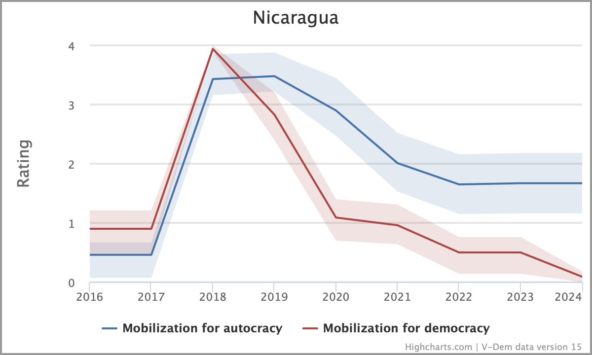 The government crackdown on the opposition continues after 2018, limiting the civic space and silencing dissenting voices. Authorities closed over 5,000 non-governmental organizations and more than 89 media outlets were forced to shut down. Nicaragua is among the countries where journalists face the most severe difficulties to freely operate. By 2024, mobilization for democracy becomes virtually nonexistent.