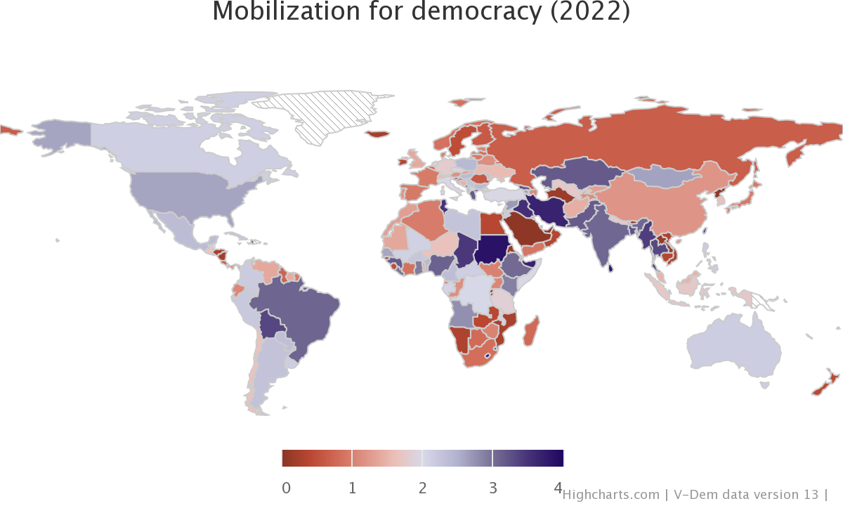 The United Nation’s International Day for Democracy comes at a time of authoritarian surge; yet citizens around the world remain defiant. This week’s graph shows the 2022 global state in mobilization for democracy.