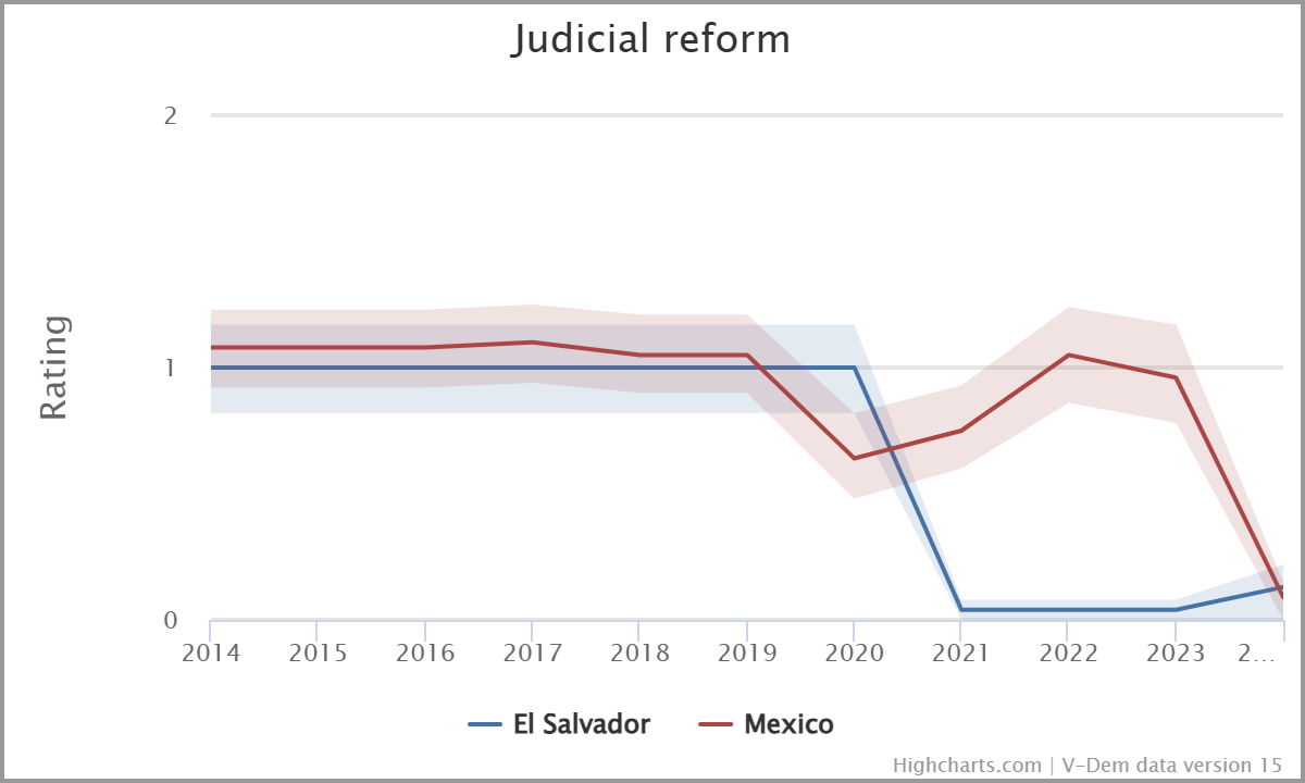 Authoritarian leaders often alter the judicial system to expand their powers. This week’s graph highlights the impacts of recent judicial reforms in El Salvador and Mexico.