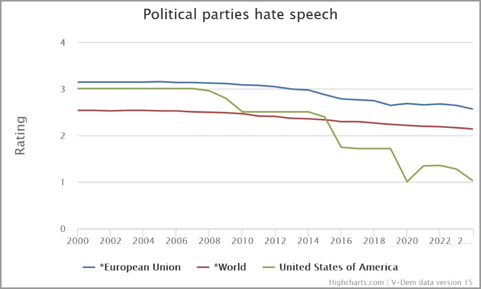 Following this first initial increase in hate speech rhetoric, an even stronger increase appeared in 2016 – the year Donald Trump was first elected. Since then, political party hate speech has been worse in the U.S. compared to the world average.