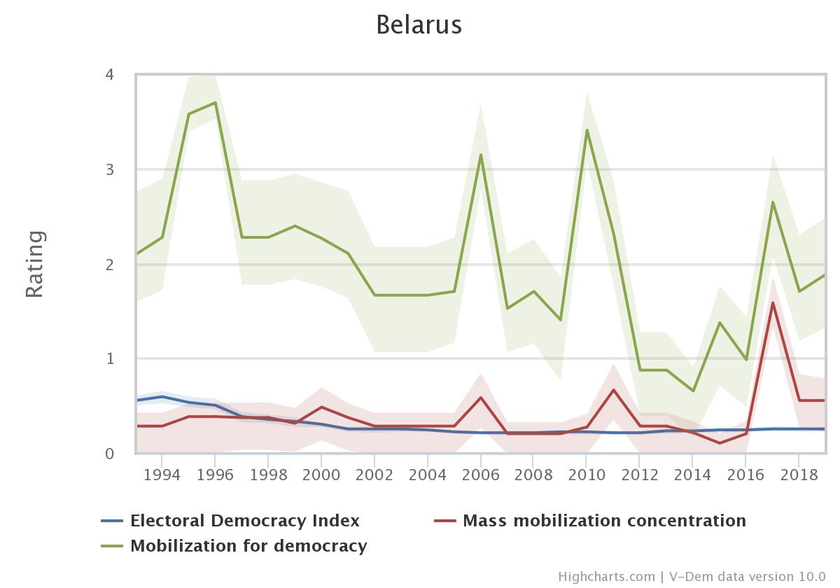 Has mass mobilization affected the quality of democracy in Belarus? V-Dem’s Electoral Democracy Index measures the extent to which the ideal of electoral democracy is achieved in its fullest sense (low to high). The graph shows no improvement during Lukashenko’s term in office, indicating that the mass protests for democratization have had little impact in the short run.