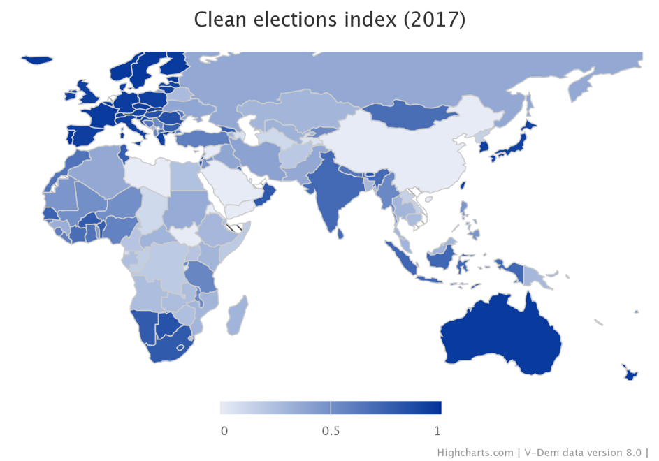 Keeping that in mind, our first Map of the Week for 2019 gives an overview of just how clean elections are perceived across Africa, Asia, Europe and Oceania by using V-Dem’s Interactive Maps tool. What do we mean by a “clean” election? Our clean elections index consists of different indicators that control for fairness, violence, voting irregularities and corruption in the context of elections. Moreover, V-Dem asks whether the Election Management Body is independent from government and has sufficient staff as well as resources to administer a well-run election.