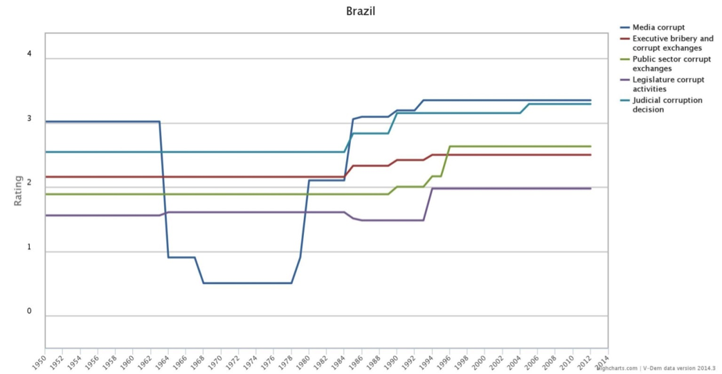 In the first ever public V-Dem dataset to be released by the 4th of January next year, three corruption indices will be available. In addition, Brazil is one of the 76 countries to be updated in March next year so stay tuned for fresh data on corruption in Brazil.